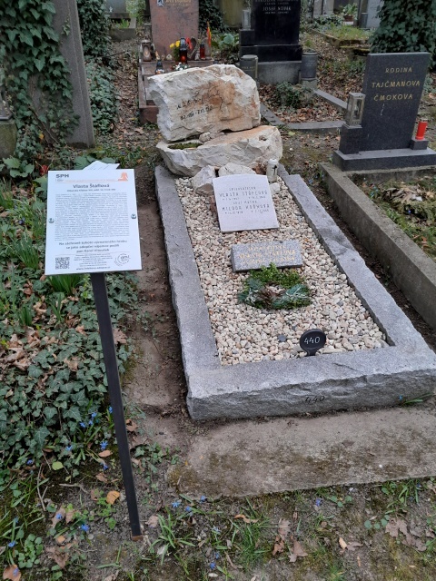 Vzpomínka na Vlastu Štáflovou u opraveného hrobu na Olšanech, duben 2024