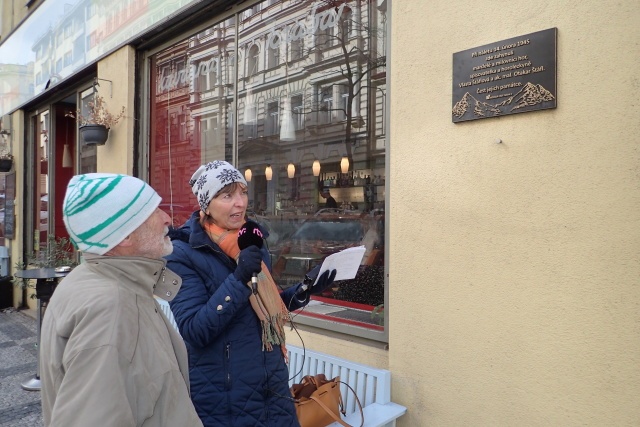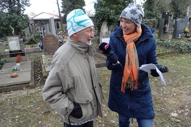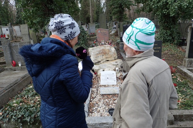 S Karlem Vitouškem a Sylvií Hoffmannovou ze slovenského Radia Regina Stred u hrobu Vlasty Štáflové a u bývalého ateliéru Otakara Štáfla v Mánesově ulici, březen 2025